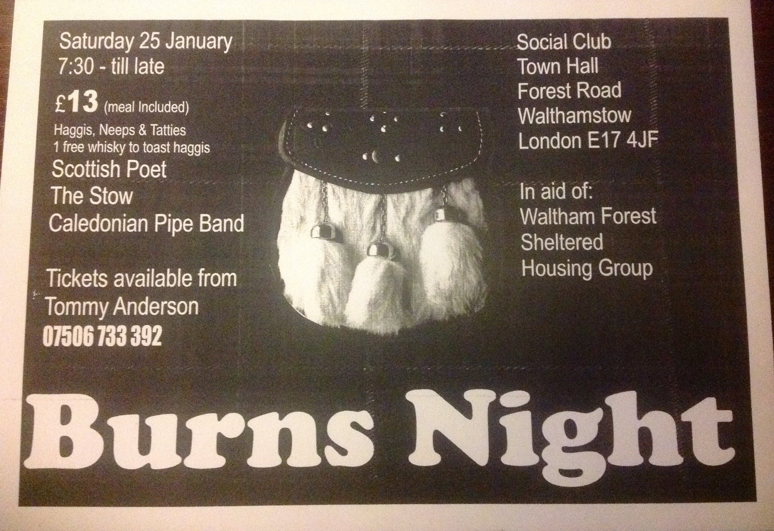 Burns Night in Walthamstow 25 Jan 7:30 to late must book tickets in advance no tickets on the door 11Jan 2014Add a comment Share this: Click to share on X (Opens in new window) X Click to share on Facebook (Opens in new window) Facebook More Click to email a link to a friend (Opens in new window) Email Click to share on Tumblr (Opens in new window) Tumblr Like Loading...