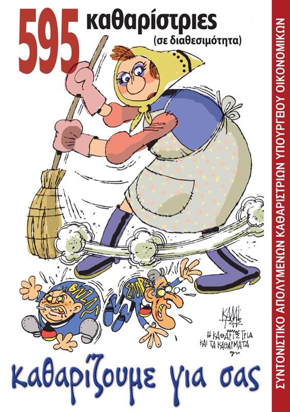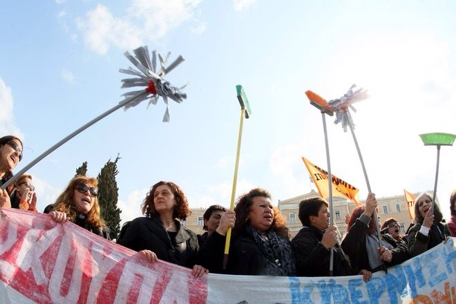 We, the 595 cleaners of the Economics Ministry, who had our jobs taken away from us on the 17th of September 2013, so that they can be given to private sub-contractors, have been fighting the last 11 months against the politics of austerity and against those who are imposing it, ie the Samaras government and the TROICA. Every day we are on the street demanding our jobs and our rights, resisting police intimidation and government propaganda. Although we have been vindicated by the Greek judiciary system the government is refusing to implement the courts’ decision.