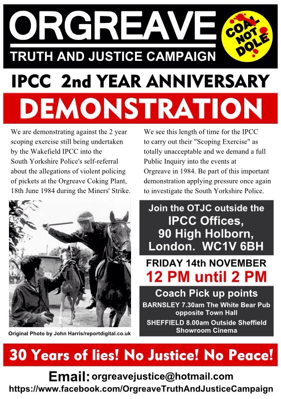 Orgreave Truth and Justice Campaign – 14th Nov Demo outside Independent Police Complaints Commission High Holborn London WC1V 6BH 6Nov 2014Add a comment Share this: Share on X (Opens in new window) X Share on Facebook (Opens in new window) Facebook More Email a link to a friend (Opens in new window) Email Share on Tumblr (Opens in new window) Tumblr Like Loading...