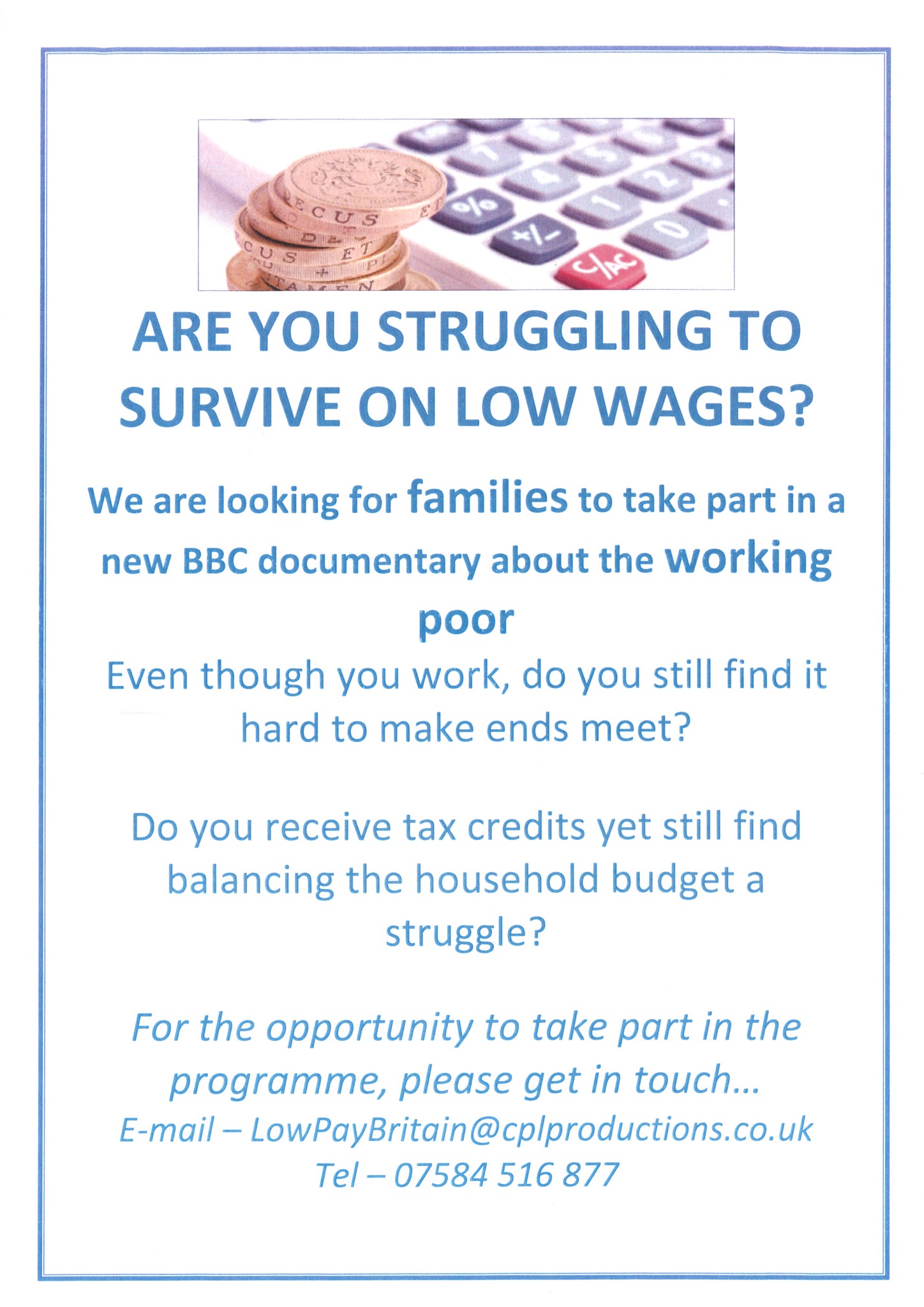 CPL Productions, is currently working on a brand new BBC One documentary called Low Pay Britain (working title). It’s an observational film about the plight of the ‘in-work’ poor and helping them find routes out of poverty.