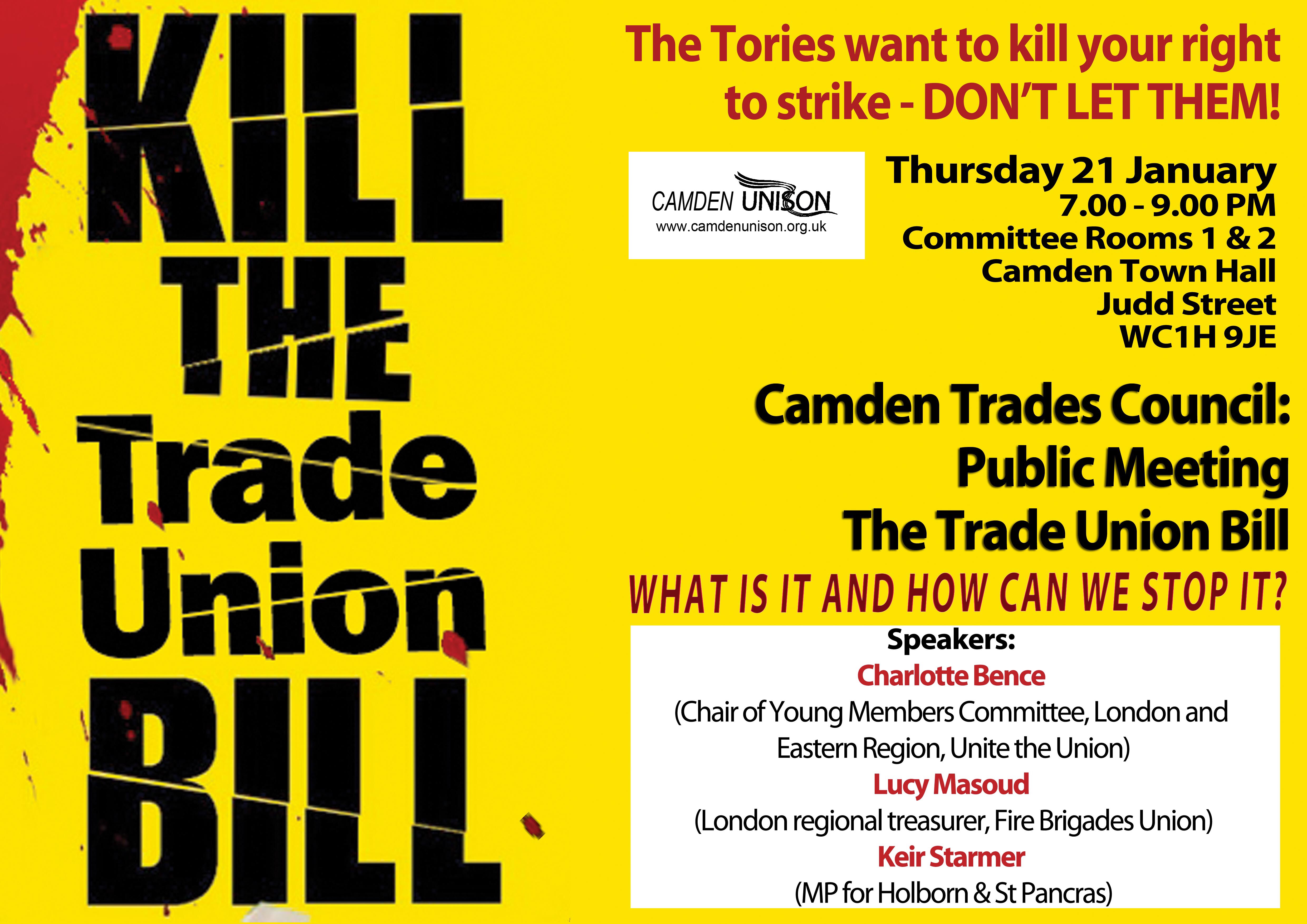 Camden Trades union Council public meeting Kill The Trade Union Bill 8Jan 20168 Jan 2016Add a comment Share this: Click to share on X (Opens in new window) X Click to share on Facebook (Opens in new window) Facebook More Click to email a link to a friend (Opens in new window) Email Click to share on Tumblr (Opens in new window) Tumblr Like Loading...
