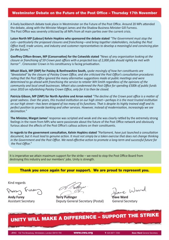 The Post office is in crisis support the strike 3 December 1Dec 2016Add a comment Share this: Click to share on X (Opens in new window) X Click to share on Facebook (Opens in new window) Facebook More Click to email a link to a friend (Opens in new window) Email Click to share on Tumblr (Opens in new window) Tumblr Like Loading...