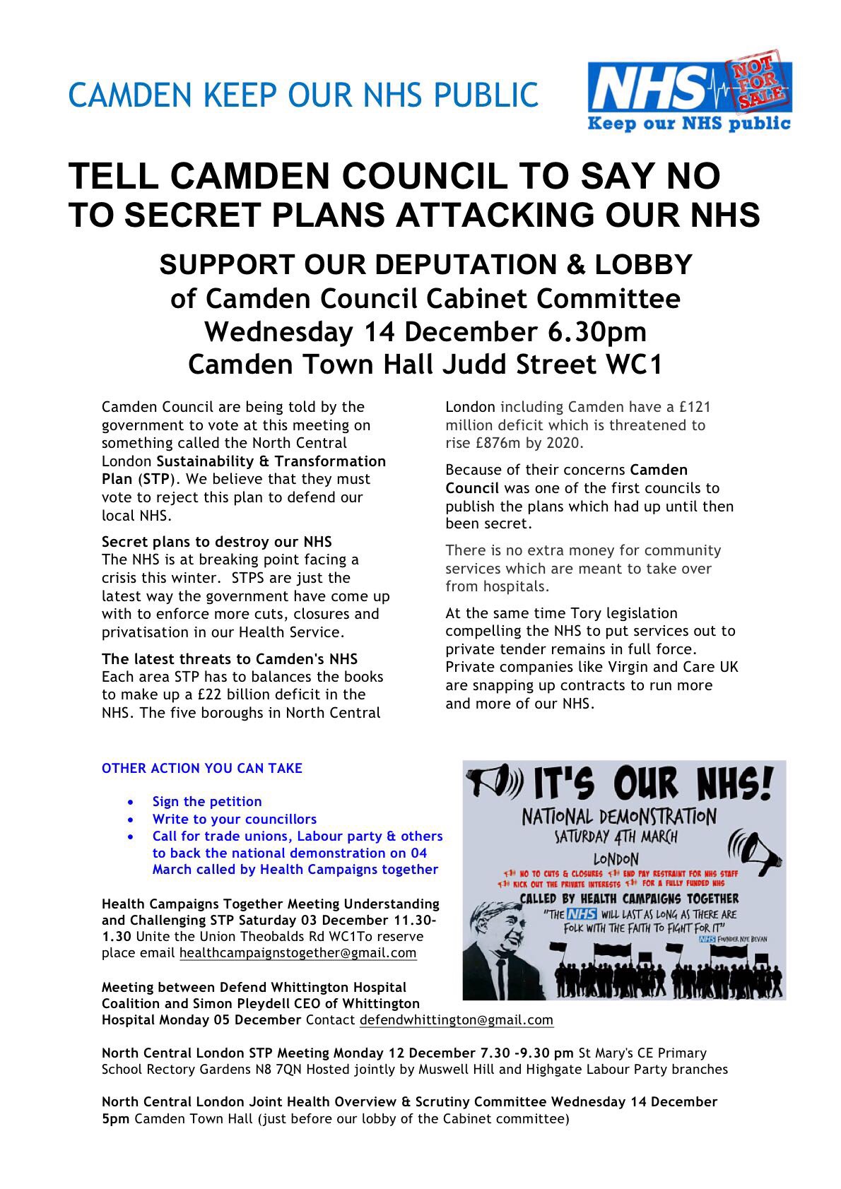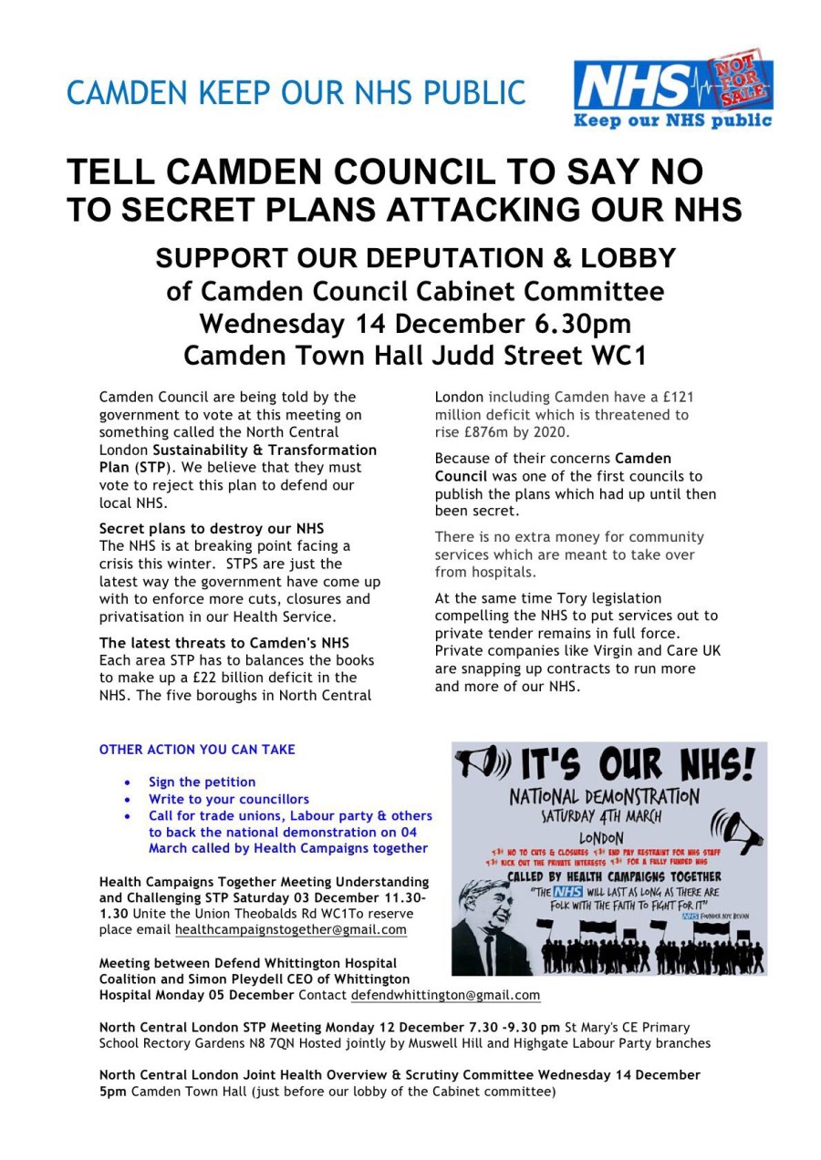 Camden Keep Our NHS Public has callled a lobby at 6.30pm on WEDNESDAY 14 DECEMBER in support of our deputation to the Camden Council Cabinet Committee at 7pm. Meet outside the Town Hall in Judd Street at 6.30pm